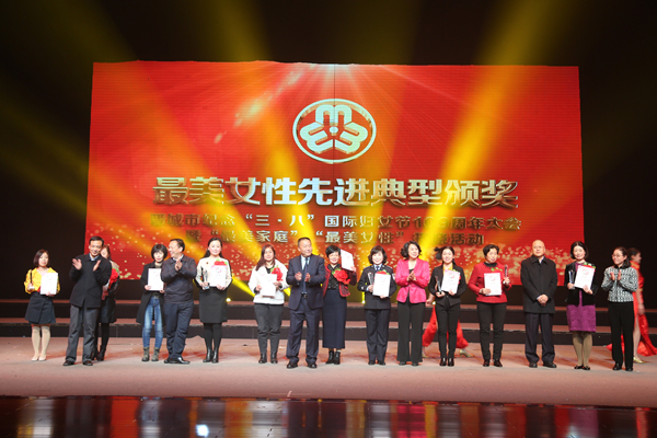 3月6日下午,由市委宣传部、市总工会、市文明办、市妇联联合举办的庆祝“三八”国际妇女节109周年纪念大会暨“最美家庭”“最美女性”揭晓活动在市歌舞剧院隆重举行。市委常委、宣传部部长赵沂旸、人大常委会副主任史晓莉、市政府副市长武健鹏、市政协副主席郭向阳、市委副秘书长宋军民、市总工会党组书记、常务副主席李勤才、市文明办主任王毅、市妇联党组书记、主席宋丽云等领导出席了活动。市妇联六届执委、妇联系统干部、受表彰的最美女性、最美家庭、市直机关妇委会主任及各界妇女代表约400人参加了活动。 市委常委、宣传部长赵沂旸代表市四大班子领导向受表彰的最美女性和最美家庭表示祝贺,向全市各界妇女致以节日问候,希望全市各级各部门要关心支持妇女工作,完善妇女权益保障机制,重视妇女健康成长,加大先进典型宣传力度,给更多优秀妇女脱颖而出创造条件,让广大妇女朋友们在你追我赶中,力争上游,再创佳绩。希望广大妇女同志树立最美形象,创造崭新业绩,把对“美”的追求延续到家庭、社会中去,传承家庭美德、营造好家风、好社风。 大会隆重表彰了我市23名“最美女性”先进典型代表、100名“最美女性”代表、65名“最美女性”提名奖、14名“敬业奉献奖”、94户“最美家庭”、20户“五好家庭”,并颁发了荣誉证书。