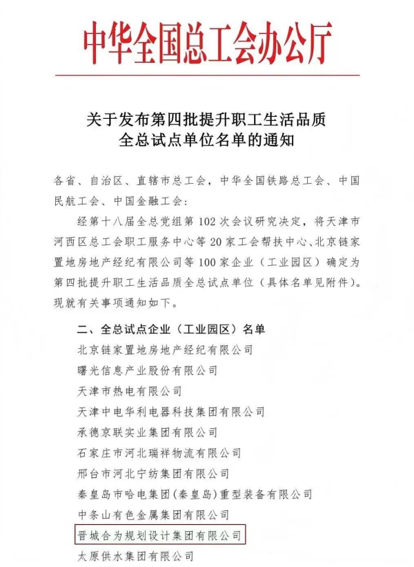 近日,全国总工会发布第四批提升职工生活品质试点单位名单。晋城合为规划设计集团有限公司成功入选,成为我市第二家获此殊荣的企业。